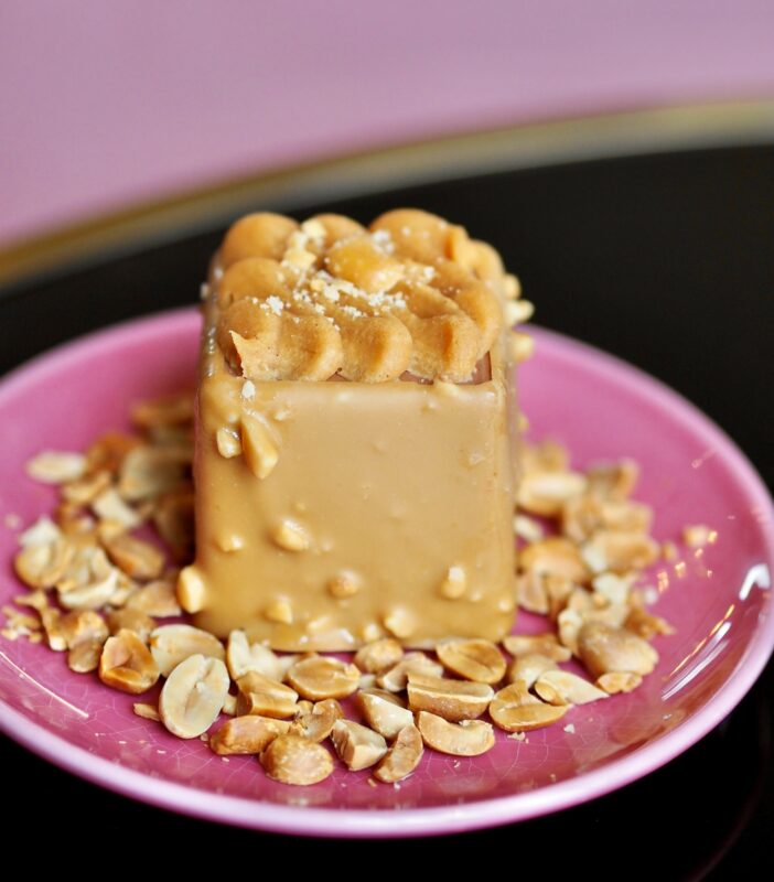 Biscuit façon crumble cacahuètes, mousse chocolat madagascar, crémeux cacahuète et glaçage dulcey